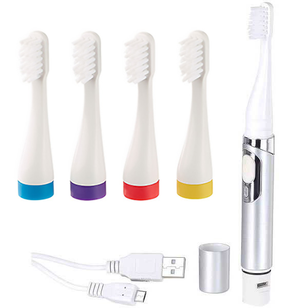 Sie pflegt die Zähne mit bis zu 28.000 Schwingungen pro Minute. Und mit einer Akku-Ladung bleibt man länger als einen Monat unabhängig von jeder Stromquelle. Aufgeladen wird sie über einen USB-Anschluss – und damit an Notebooks, Powerbanks oder einem unserer Reisenetzteile, die mehrere Geräte über Nacht mit Ladung versorgen. Ein 4er-Set Ersatzbürstenköpfe ist für kurze Zeit bereits enthalten.